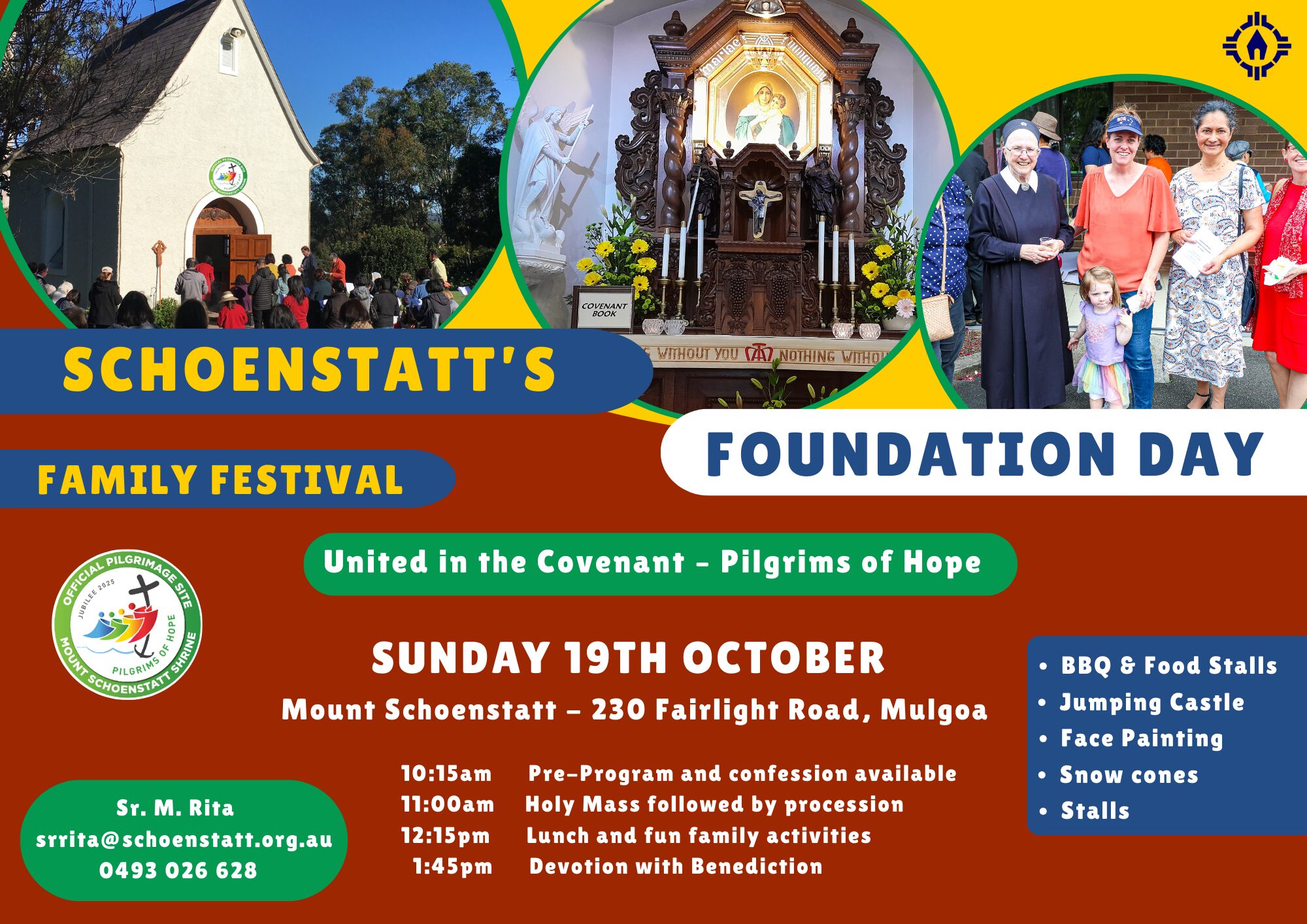 Join us on Sunday 19th October as we celebrate Schoenstatt's Foundation Day with a family festival! BBQ & Food Stalls Jumping Castle Face Painting Snow Cones Stalls 10.15am Pre-program and confession available 11.00am Holy Mass followed by procession 12.15pm Lunch and fun family activities 1.45pm Devotion with Benediction