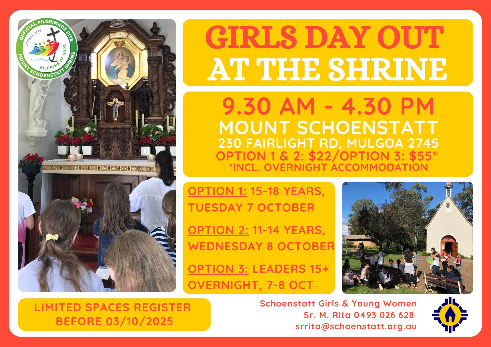 Wednesday 8th October 9.30am-4.30pm Girls aged 11-14 years Limited Spaces - Register before 3rd October 2025 Contact Sr M Rita 0493 026 628