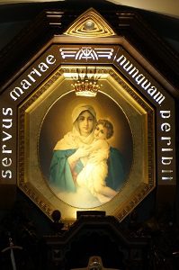 Schoenstatt did not have a picture for its shrine until April 1915, when one of the teachers in the school, Fr. Huggle, gave the students a lithograph print of a Madonna and Child in an octagonal frame. He knew of their need, saw this picture in a shop, and purchased it as a gift for the boys for some 23 Marks. It was placed in the Shrine on or shortly before April 30, 1915 and given the title “Mother Thrice Admirable” shortly thereafter.